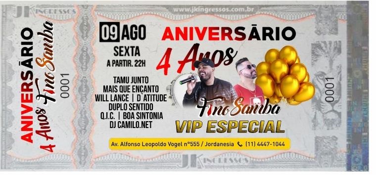 Amanha Quinta-Feira dia 08 de Agosto iremos sortear 3 pares de ingressos para o Aniversário de 4 Anos do Grupo Fino Samba que acontece Sexta-Feira dia 9 à partir das 22hrs no BY BRASIL em Jordanésia ao lado do posto Ipiranga.